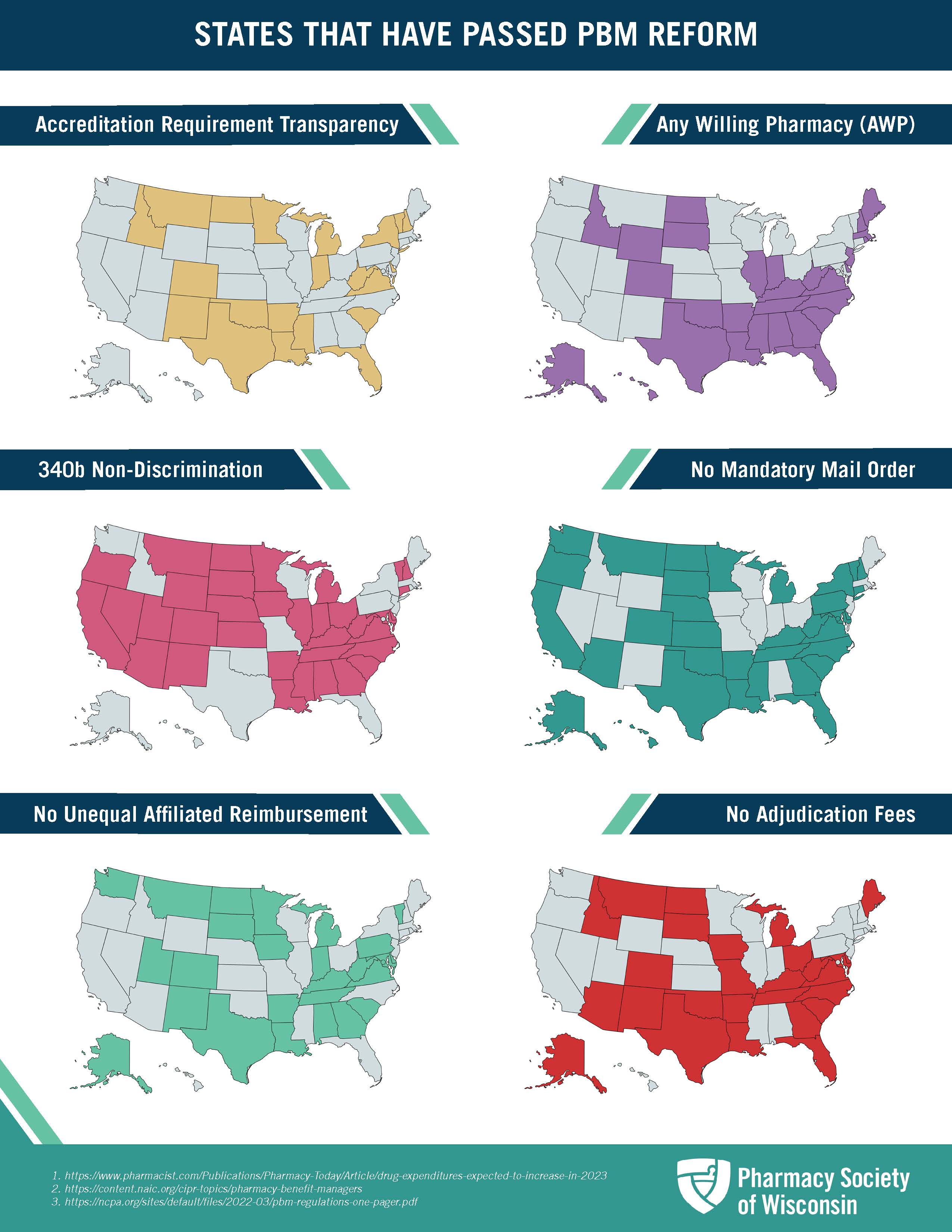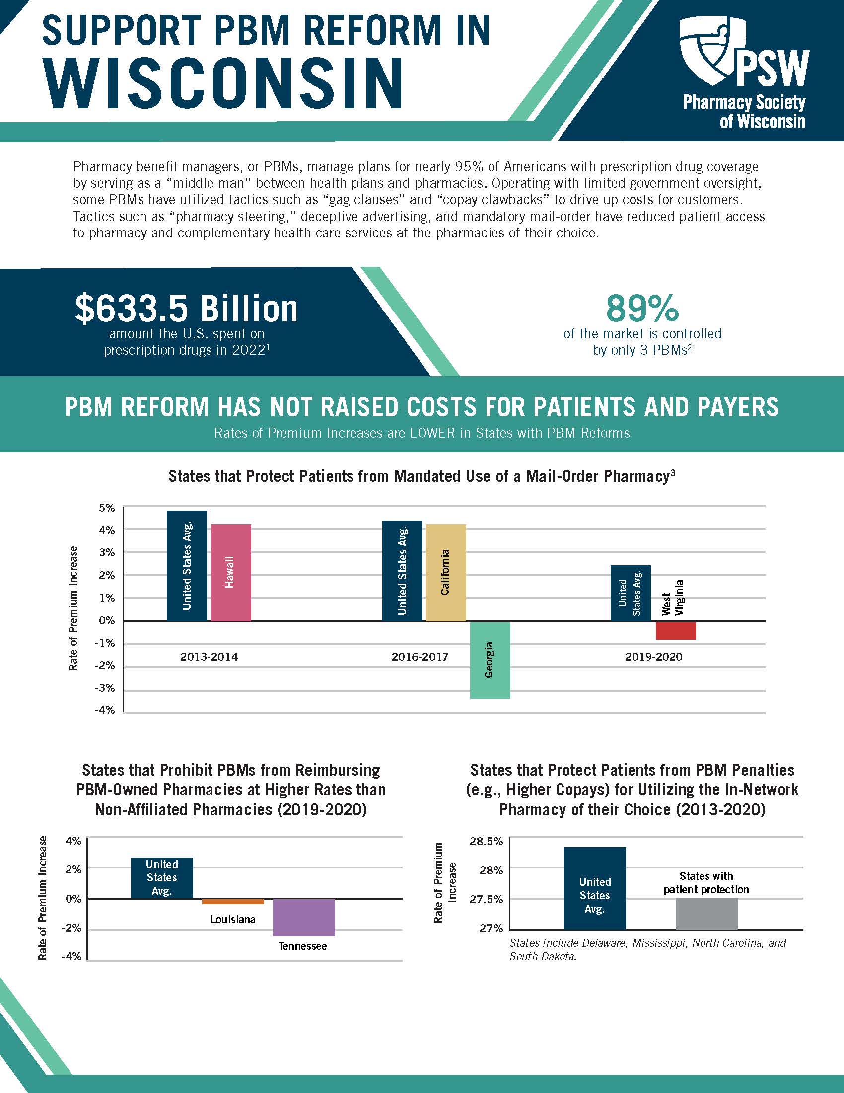 Pharmacy benefit managers (PBMs) play a powerful role in determining how prescription drugs are covered, priced, and reimbursed -- but too often, their practices create barriers to patient care and threaten the sustainability of pharmacies. PSW is committed to advocating for meaningful PBM reform that promotes transparency, accountability, patient access, and fair reimbursement for pharmacies.